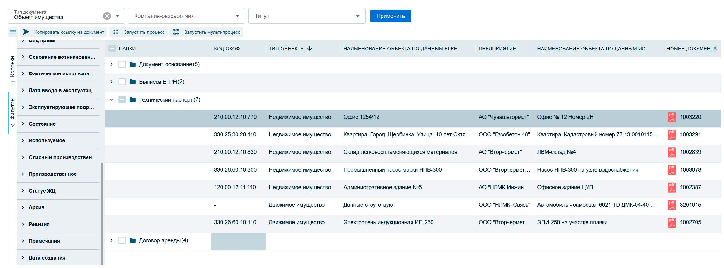 Все связанные документы (договоры, акты, разрешения, технические паспорта и др.) непосредственно привязаны к этой карточке объекта в системе.
