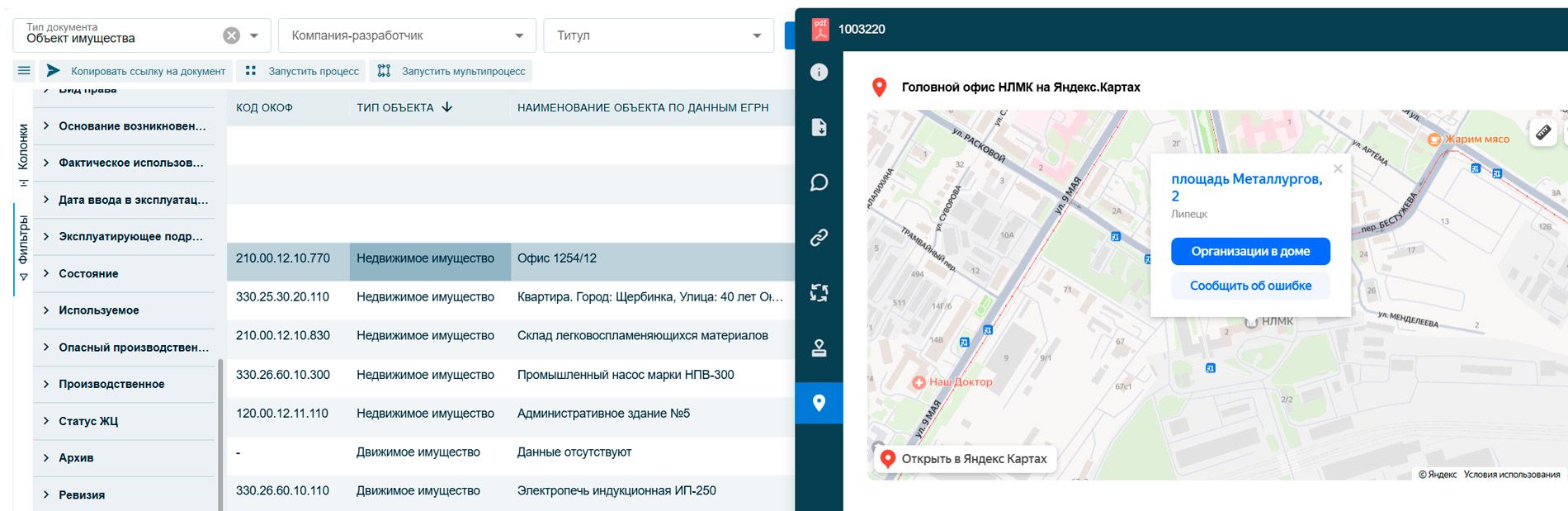 По клику мышки на метку объекта на карте мгновенно открывается его полная карточка в системе, что ускоряет доступ к данным и документам. - Проводить геоаналитику.